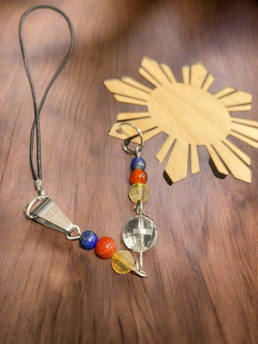 Philippines Flag: Carnelian, Lapiz Lazuli, Yellow Quartz & Clear Quartz focal point along with a stainless steel branded bail.