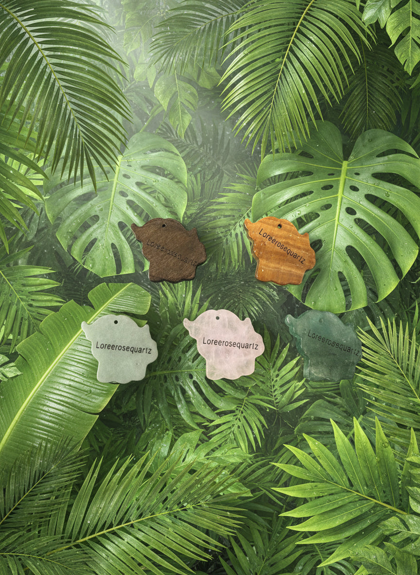Row 2: Green Alashan Agate, Rose Quartz, Green Strawberry Quartz